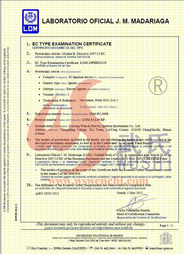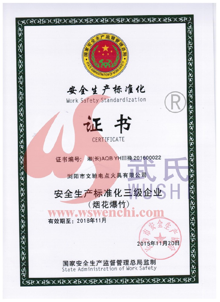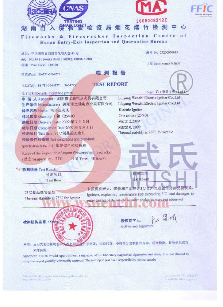 瀏陽市文馳電點火具有限公司(原培文電子點火器材廠),創(chuàng)建于1998年,是一家專業從事研制銷售電子點火產品的民營科技企業,是我國第1枚煙花用電點火頭生產者,是《煙花爆竹電點火頭國標》牽頭起草單位。公司位于中國“煙花之鄉”湖南省瀏陽市,地理位置優(yōu)越,交通便利。    我公司研制的對象是用電能引燃火藥、做機械功等預定功能的一次性使用的元件或裝置,包括電點火頭(英文名ElectricMatch or Electric Igniter,中文俗稱“電火柴”或“電發(fā)火頭”)、電點火管和延期電點火管;我們估且在以后的產品技術欄中將我們研究的產品統稱為電點火具,將電點火器看成是用于提供和控制供給電點火元件點火的電能器材;我們研究的電點火橋路有橋絲式、無橋絲···